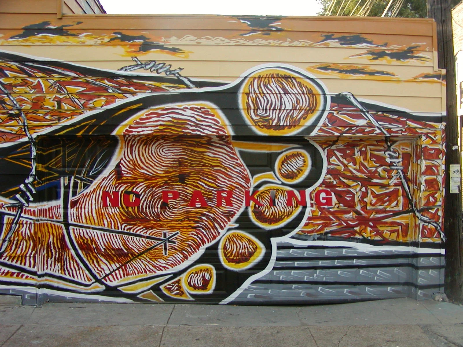 Other symbols/images in the mural include a reference to the torture of Aztec emperor Cuauhtémoc at the hands of Spanish conquerors, who burned Cuauhtémoc's feet. The fingerprint-like lines present on the sole of the foot have marked Duarte's studio work and suggest issues of identity or perhaps criminality. The mask worn by the giant transforms him and obscures who he is.